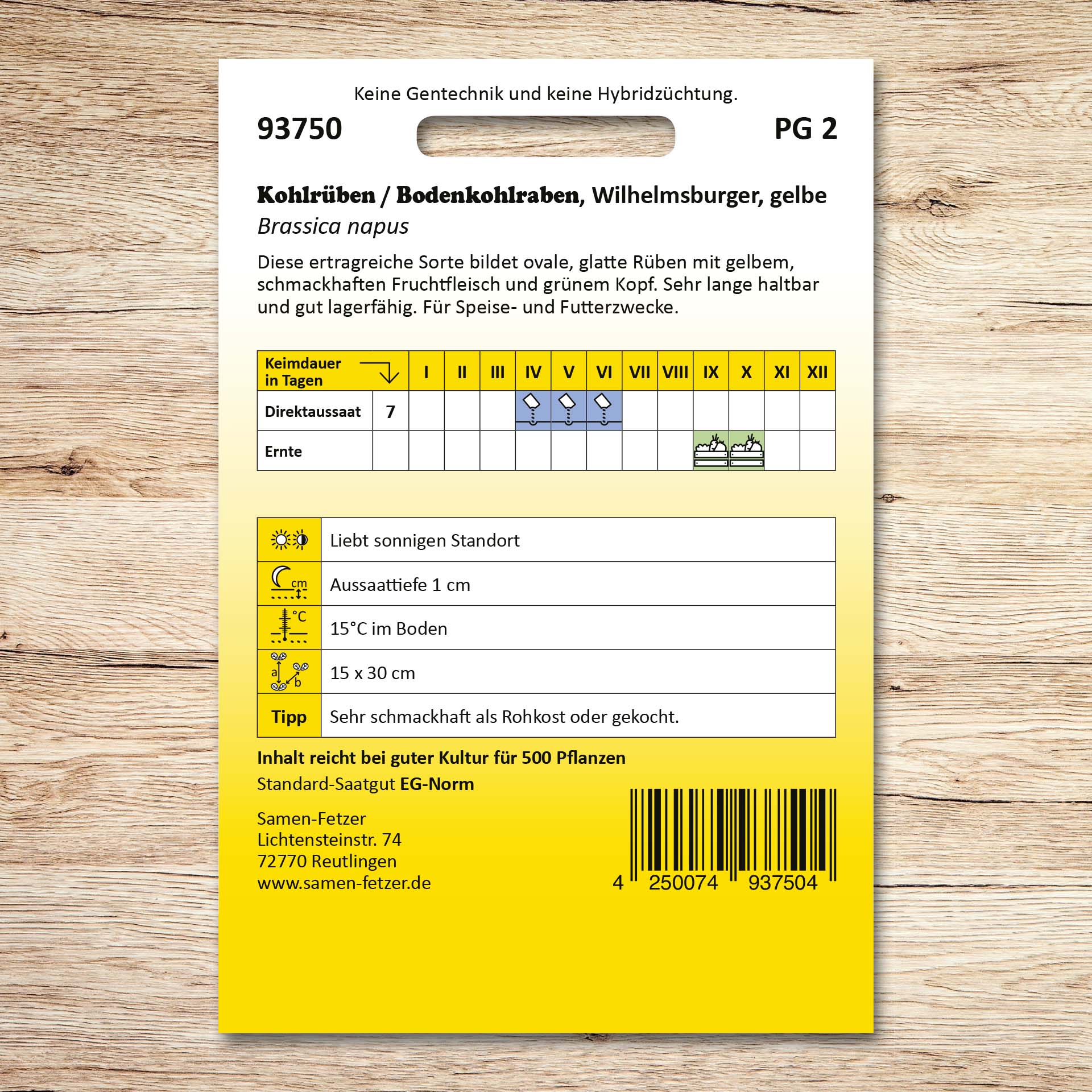 | Aussaat: | April, Mai, Juni, Juli, August |